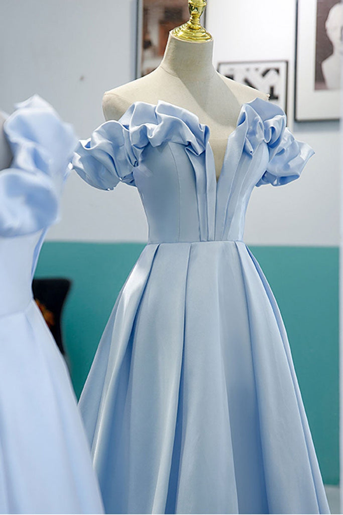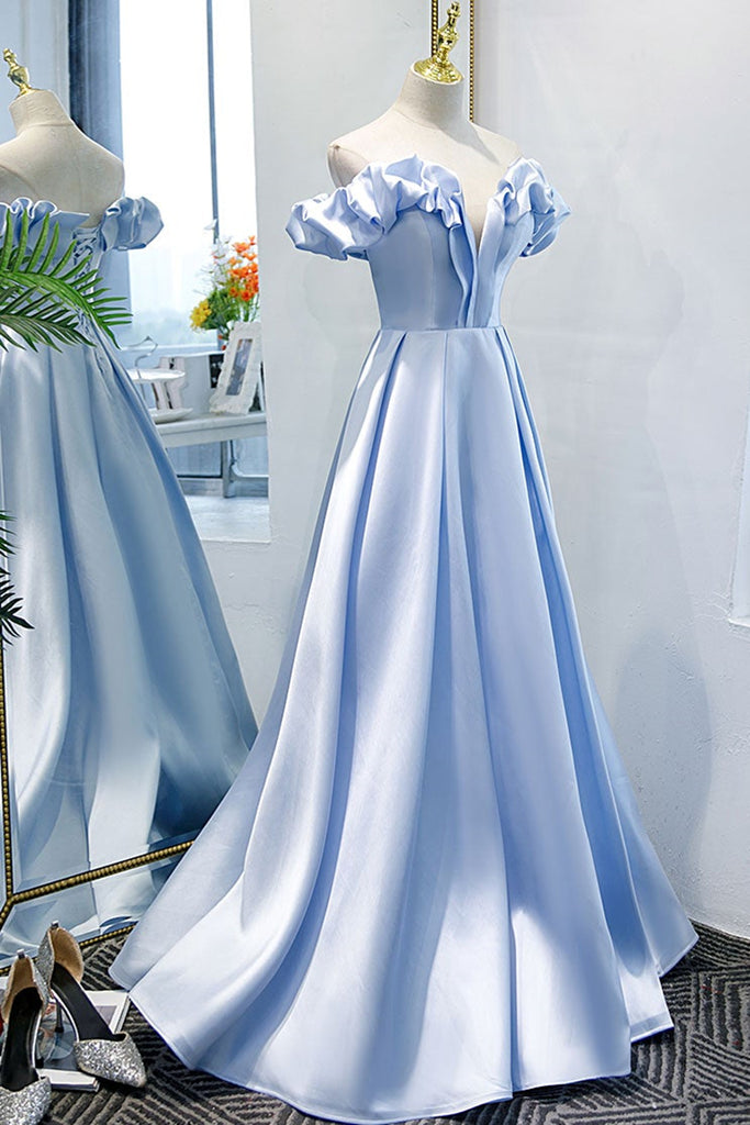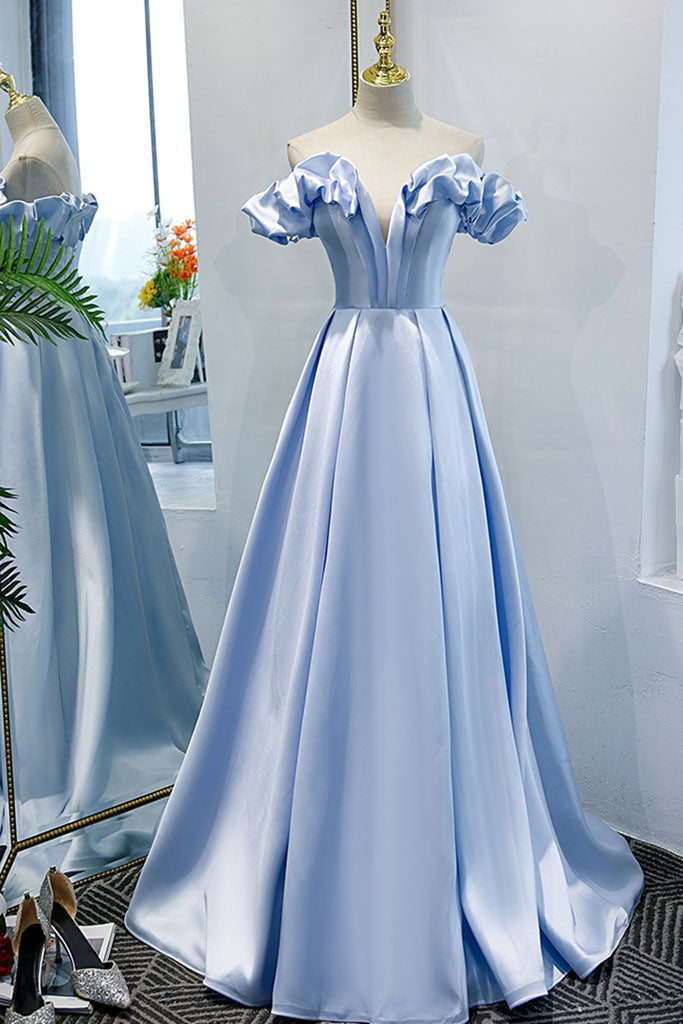 Unique Off Shoulder Blue Satin Long Prom Dresses, Long Blue Formal Graduation Evening Dresses