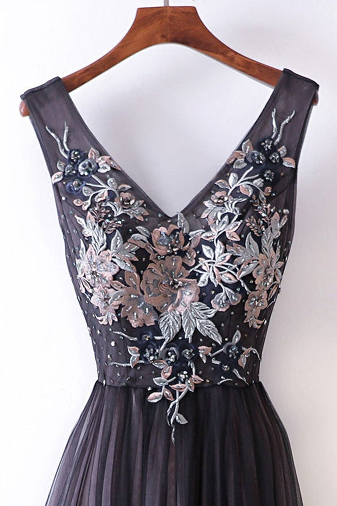 V Neck Black Tulle Long Prom Dresses with Lace Appliques, Black Floral Long Formal Graduation Evening Dresses