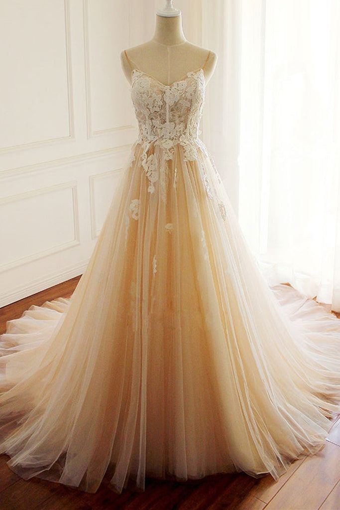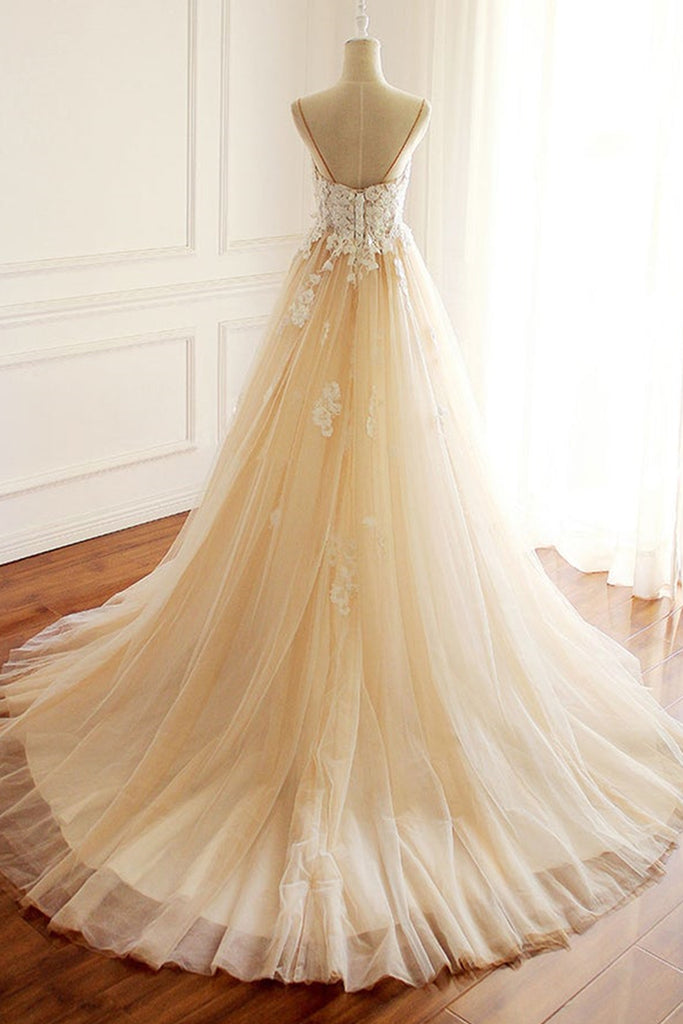 V Neck Open Back Champagne Tulle Lace Long Prom Dresses, V Neck Champagne Formal Dresses, Champagne Lace Evening Dresses