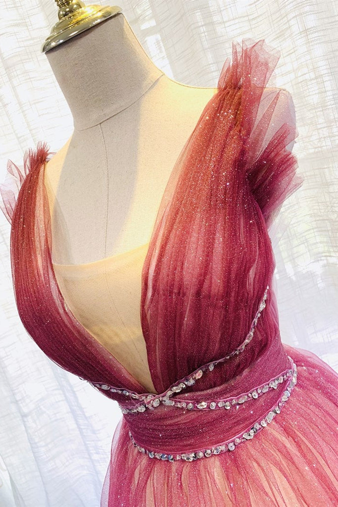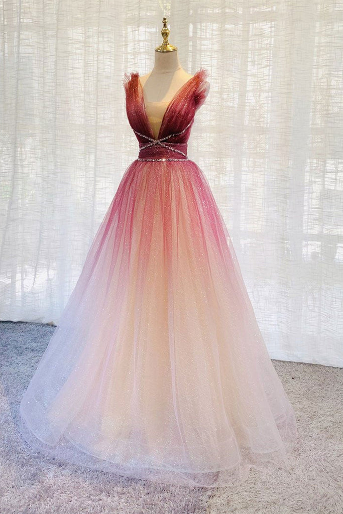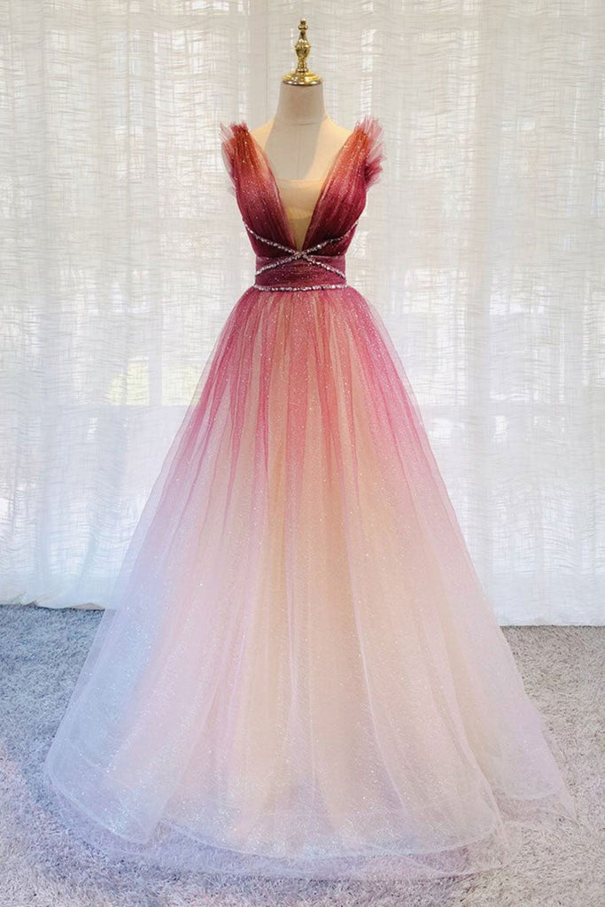 V Neck Open Back Ombre Tulle Long Prom Dresses with Belt, V Neck Beaded Ombre Formal Evening Dresses