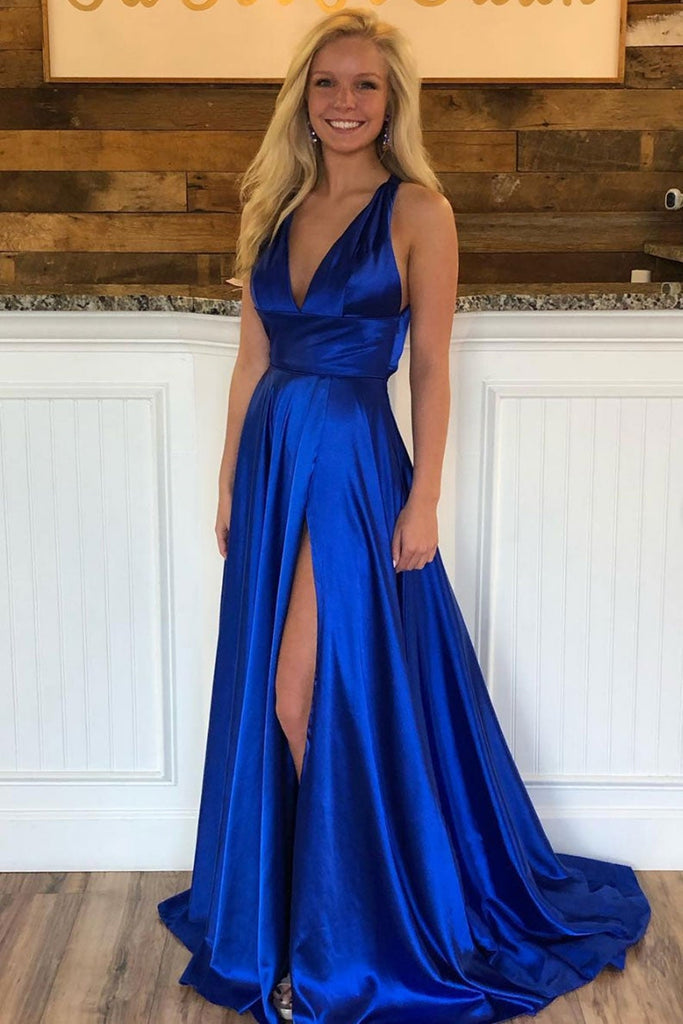 V Neck Royal Blue Satin Long Prom Dresses with High Slit, Royal Blue Formal Graduation Evening Dresses with Cross Back