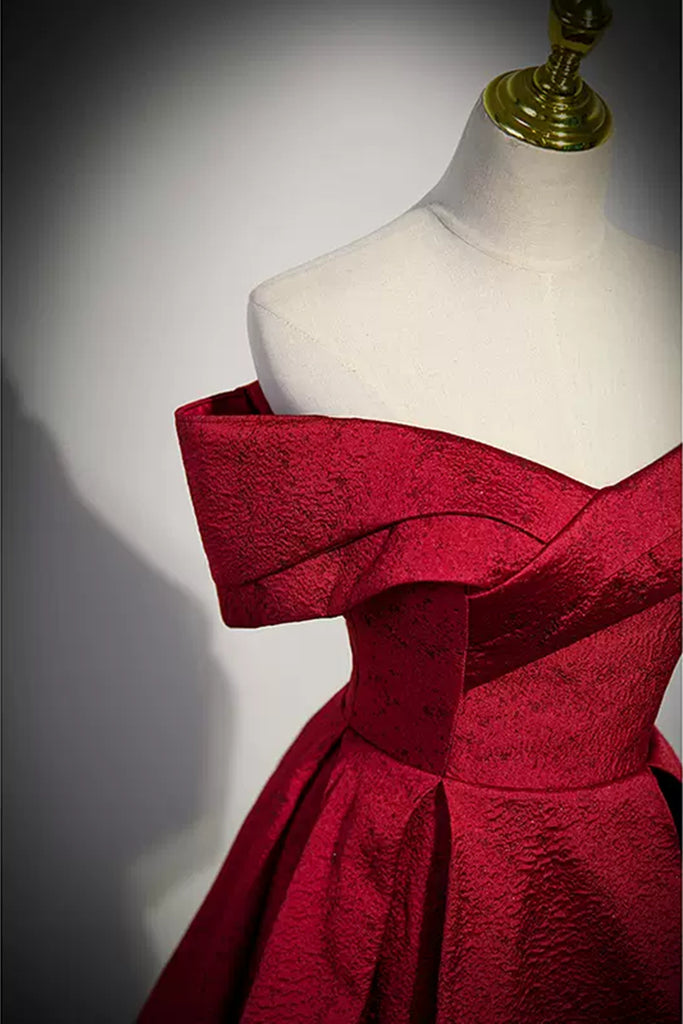 Wine Red Satin Off the Shoulder Long Prom Dresses, Off Shoulder Burgundy Formal Graduation Evening Dresses WT1242