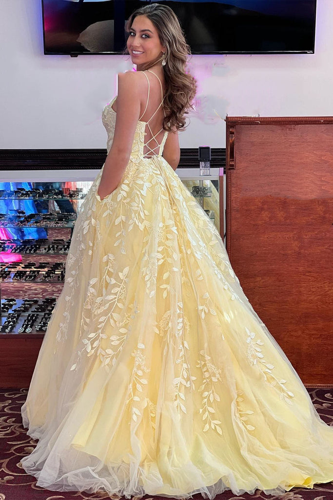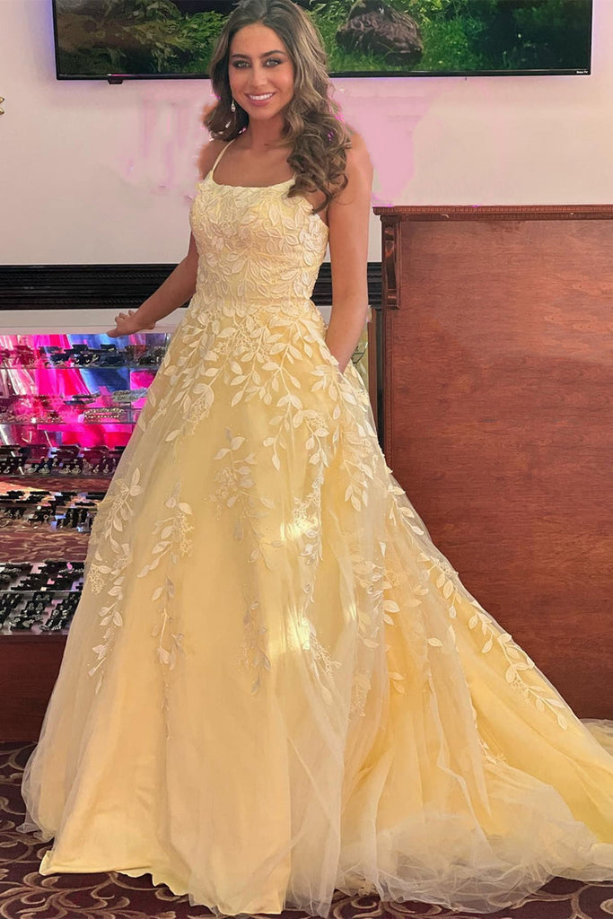Yellow Tulle Open Back Lace Long Prom Dresses, Yellow Lace Formal Dresses, Yellow Evening Dresses WT1153